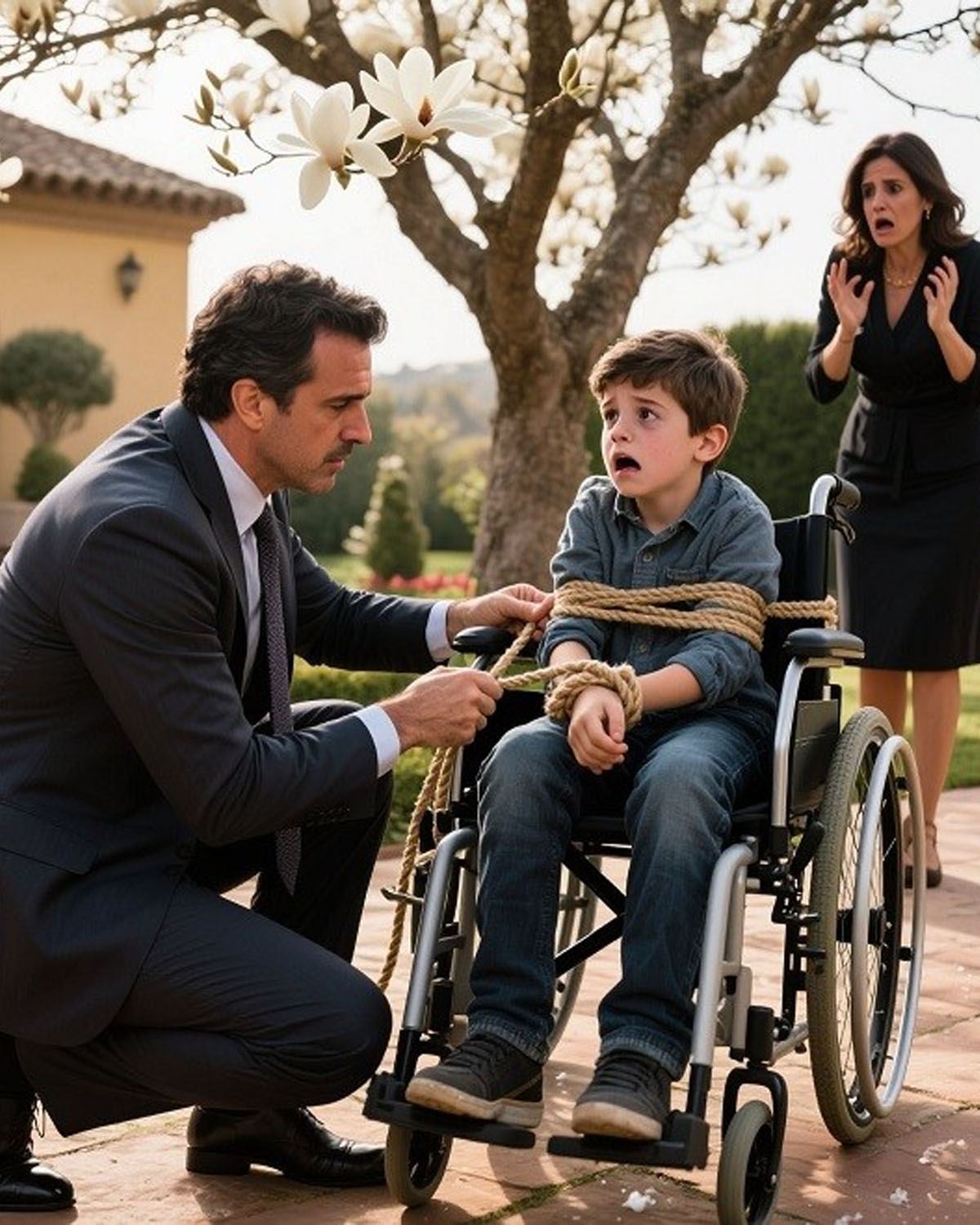 Sandra stond naast hem, rustig, alsof er niets aan de hand was. Ze wapperde met een tijdschrift en fluisterde venijnig: “Zie je? Papa komt je niet redden. Hij is druk bezig met geld verdienen. Hij heeft me een nieuwe auto gekocht. Een auto voor jou? Nee. Want dat ben je: een kreupele vastgebonden aan een stoel.”