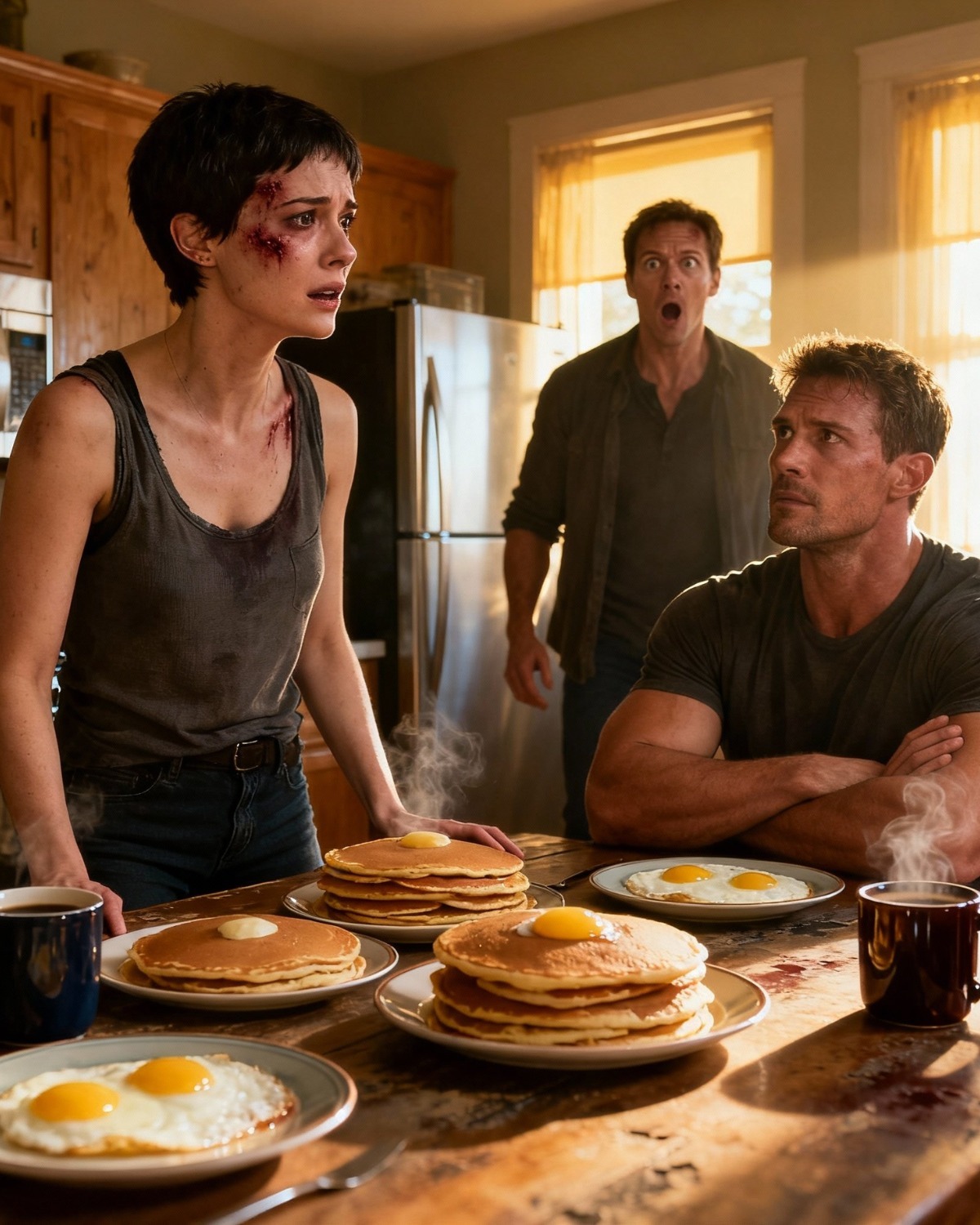 Nadat mijn man me had geslagen, ging ik zonder een woord te zeggen naar bed. De volgende ochtend werd hij wakker door de geur van pannenkoeken en de aanblik van de tafel vol heerlijk eten. Hij zei: “Oké, je snapt het eindelijk.” Maar toen hij de persoon aan tafel zag zitten, veranderde zijn uitdrukking onmiddellijk…