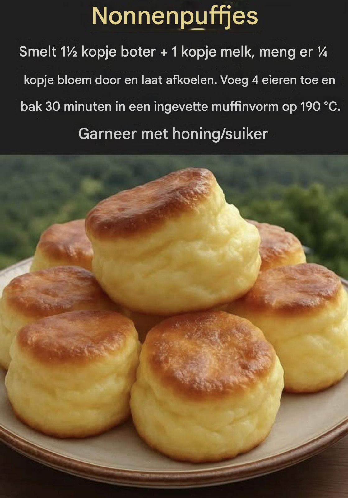 Nonnenpuffjes zijn charmante, ouderwetse gebakjes die zowel elegant als onweerstaanbaar lekker zijn. Met een knapperige buitenkant en een zachte, luchtige binnenkant smelten ze letterlijk in je mond. Ze worden gemaakt van een rijk deeg op basis van melk en boter, luchtiger gemaakt door eieren, en zijn perfect voor ontbijt, tussendoortjes of een licht dessert.